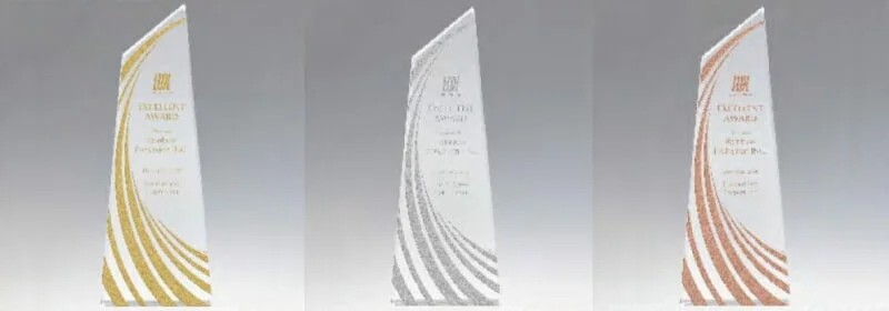 ◆印刷では不可能な輝く金色・銀色・銅色の文字が表現可能なクリスタルトロフィー。箔加工なので文字・ロゴに厚みがあり高級感ある仕上がりになります。